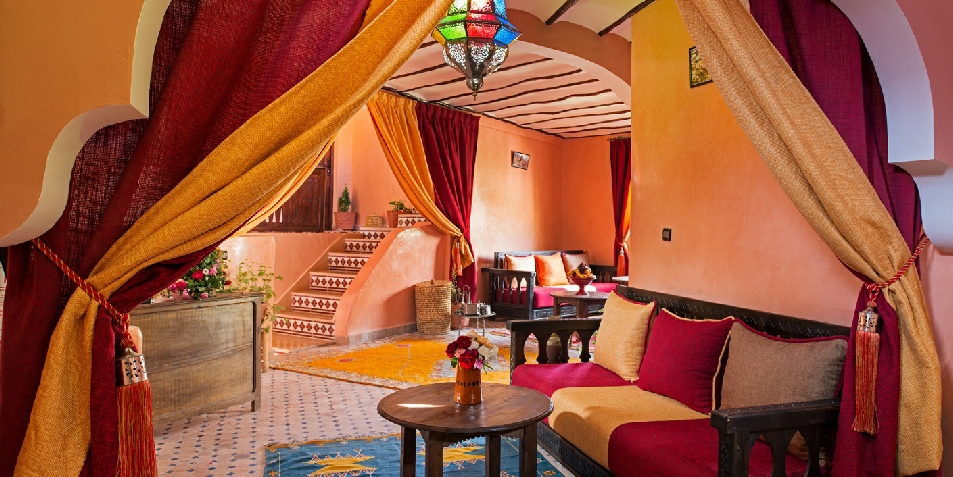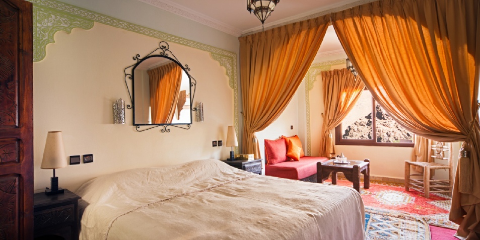 Decorated by traditional Moroccan style with colorful fabrics, air-conditioned rooms at the Riad Atlas Toubkal offer views of the mountains and the countryside. The hotel serves a daily continental breakfast. And dinner, the riad can prepare, on request, Moroccan specialties to be enjoyed in the dining room. They are equipped with a CD player, hair dryer and complimentary toiletries.